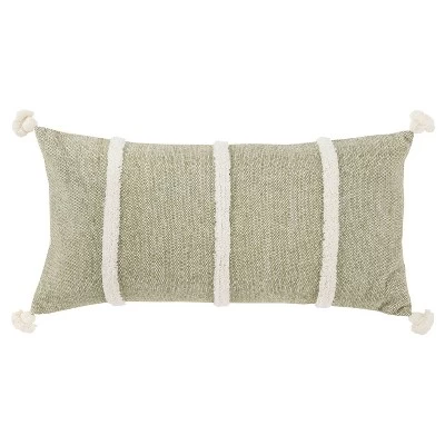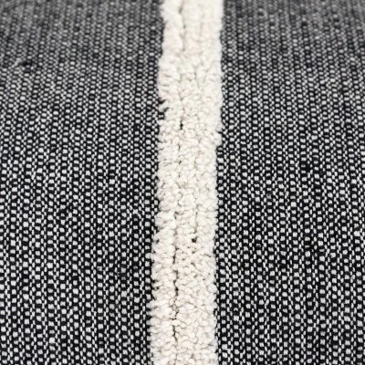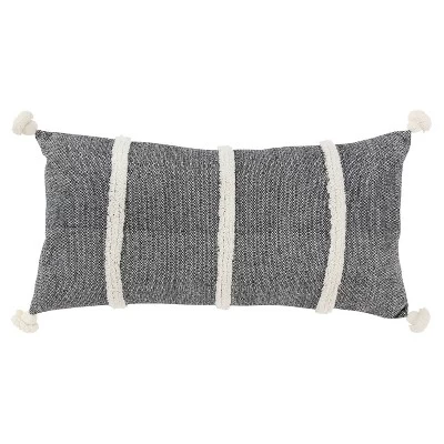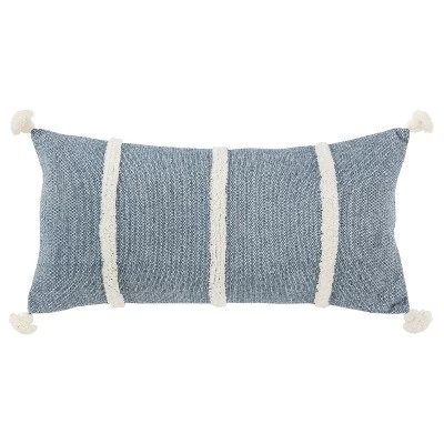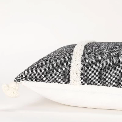 This woven knife edged pillow features a two color weave that lightens the color and gives this pillow an artisinally crafted look. Soft cotton dimensional rows lend a striped appearance to this non-solid solid pillow. Four plump hand crafted cotton tassels grace each of the four corners. The back of this pillow is a solid coordinating cotton with a zippered closure for ease of fill.