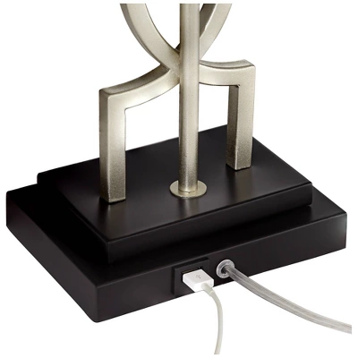 With abstract-shaped bases in a brushed nickel finish and curved rectangular shades, these modern table lamps make bold statement pieces. Each design sits on top of a black marble pedestal. Each lamp has an integrated USB port for easy charging of your devices. The USB ports work with the light turned off and are meant for use with smartphones.