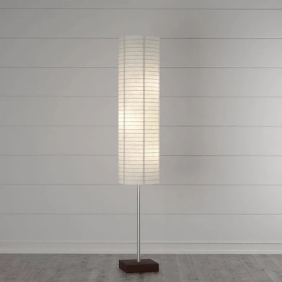 The versatile Gyoza Floorchiere Floor Lamp features a modern design inspired by traditional Japanese lanterns, adding modern style and drama, as well as plenty of ambient light, for a living room or den. The collapsible white rice paper shade is constructed with a walnut base and brushed steel pole that support three stacked bulbs inside. A convenient foot step switch allows you to turn the lamp on and off with just your foot. This lamp has a clear cord and is smart outlet compatible. Bulbs not included.