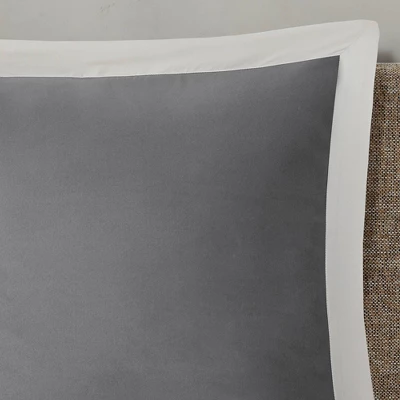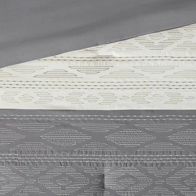- Transitional 8 piece comforter set in two main tones (grey and oatmeal) with embroidered and pieced details