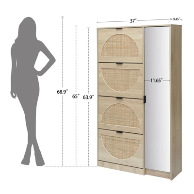 - Functional shoe storage cabinet with rattan, mirror door, and 4-tier shelves