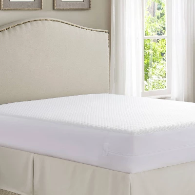 The All-In-One Comfort Top Mattress Protector with Bed Bug Blocker provides powerful protection against bed bugs, dust mites and other allergen irritants. We begin with a soft knit fabric and line it with a special permanent coating. This coating, along with our double sewn seams, provides a complete barrier. The encasement closure is extra secure and features a triple-seal closure system which has an inner flap, a hook & loop hidden seal and a nylon zipper to block bed bugs and dust mites, as well as allergy irritants. The stretch sidewalls neatly fit most mattresses/box springs up to 15 inches. Cover: 100% Polyester; Lining: 100% Polyurethane; Reverse: 50% Polypropylene/50% Polyethylene; Sidewall: 100% Polyester. Machine wash cold. Permanent press cycle with like colors. Do not bleach. Tumble dry no heat. Do not iron. Do not dry clean.