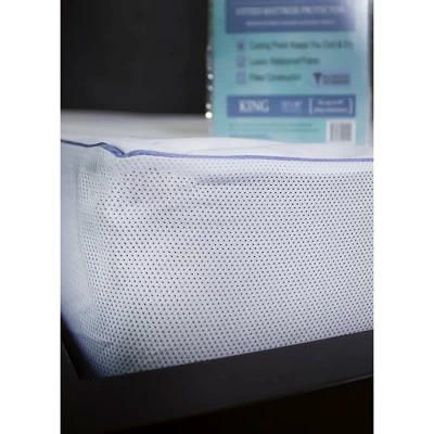 ProtectEase® Cooling Comfort fitted mattress cover utilizes a hi-tech fabric blend to keep you cool and dry while providing a water, stain and spill proof barrier that is durable, quiet and comfortable. The elasticized sides provide for a snug fit on any mattress up to 18 inches thick. Machine wash with hot water and tumble dry on low heat.