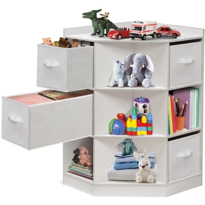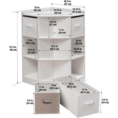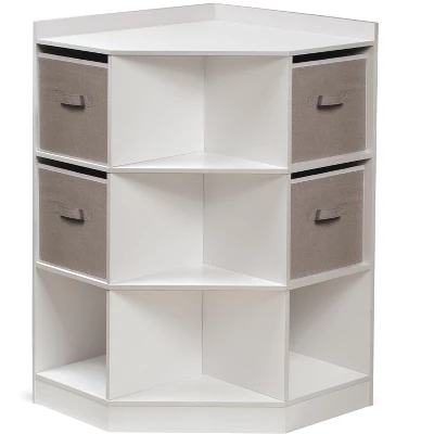 The Corner Cubby Storage unit’s unique design is perfect for maximizing storage space in often unused corners. The storage unit includes 9 cubby shelves, 4 reversible baskets and a bonus top shelf with lip. Great for storing books, stuffed animals, arts & craft supplies, and more! The solid rear panel construction means items and bins will not fall through the back. Perfect for bedrooms, playrooms, and other areas where space is limited. With 2 large and 2 small reversible baskets, the Corner Storage Cubby is sure to blend in with any décor. Each of the cubbies are open in the back allowing full access from either side of the unit. Smooth surfaces are easy to clean and maintain. Made with laminated wood, melamine finish, and metal hardware. Baskets made with non-woven fabric and have internal cardboard support panels. Overall measurements are 22.5 inches L x 22.5 inches W x 37 inches H. The top shelf with lip measures 23 inches deep from back corner to front of unit. Each angled shelf is 8 inches deep and 15 inches wide at the opening. All of the six cubbies measure 21.75 inches D x 10.25 inches W x 10.25 inches H. The small bins measure 11 inches L x 10 inches W x 9.5 inches H. The large bins measure 21.25 inches L x 10 inches W x 9.5 inches H. Assembled weight: 52.5 pounds. All measurements approximate. Wipe clean with a damp cloth and mild detergent as needed and dry thoroughly. Spot clean the baskets as needed with cold water and mild detergent and allow to air dry (never immerse in water). Adult assembly required. Illustrated assembly instructions included. Non-toxic. Product complies with all currently applicable safety standards and CARB ATCM standards. Product may vary slightly from shown and described. Props/accessories shown are for illustration purposes only and are not included with the product. Actual color/finish may vary slightly from screen display. This item ships in its original carton that may include a product photo.