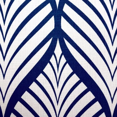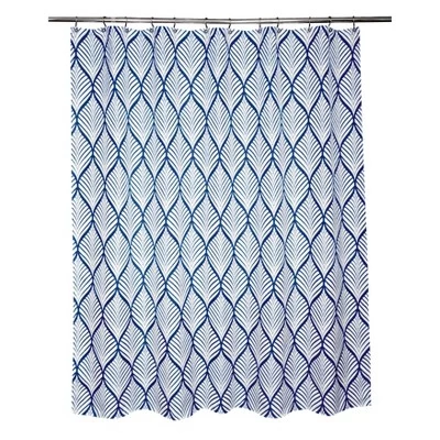 The Deco Leaf fabric shower curtain by Moda, is a stunning addition to any washroom space. This shower curtain is designed in attractive navy blue and white tones, with a subtle textured slub background. This fabric shower curtain is easy care, machine washable. Made of 100% Polyester. We recommend the use of a liner with this product.