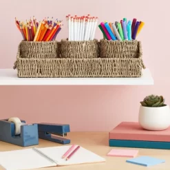 This set of round storage baskets for organizing comes with a rectangular tray that provides versatile storage for various items. Use each wicker utensil holder for kitchen counter storage, as a pencil holder, or to organize beauty products, spices, and general household items. The versatile design of each wicker container will look great in the bathroom, laundry room, living room, and bedroom for decorative and convenient storage. This pack comes with 3 wicker baskets for storage and 1 rectangular seagrass tray; 4 pieces total.