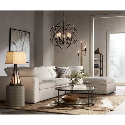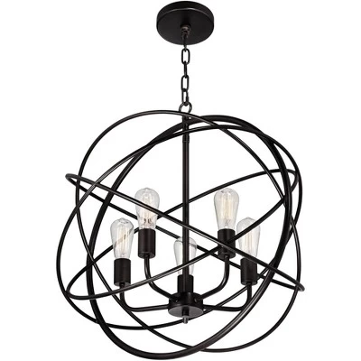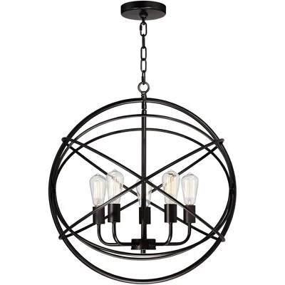 - Orb chandelier with an industrial look from the Franklin Iron Works⢠lighting brand.