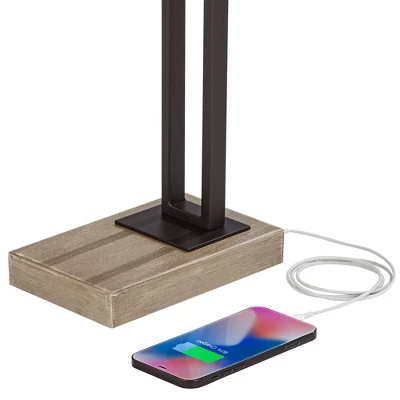 Brighten up your living space with this handsome industrial table lamp from the Franklin Iron Works brand of lighting. It comes in a bronze finish metal column frame, set on top of a wood finish rectangular base. A blond natural mica shade hangs from the top, directing light downward, while a USB port and power outlet are built into the base.