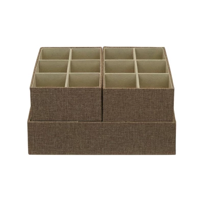 Keep all your accessories and supplies in contained, organized spaces with these Drawer Organizer 3-Piece Sets from Household Essentials. This starter set offers 1 large and 2 small organizer trays with customizable compartments and conveniently notched edges. This starter set will give you a head-start on achieving a refined and organized living space. These organizer trays offer unique versatility with their fully customizable inserts and sturdy construction. The large tray can be customized to hold up to 9 slots for detailed storage of socks, underwear and T-shirts. The smaller trays can hold up to 6 slots for smaller accessories such as hair clips, sewing supplies, jewelry and more. These trays can be customized to create small, medium, large or long slots. All inserts can be removed to create an extra-large storage option for washcloths and other larger items as well. While other organizers remain static, these removable inserts introduce flexible organization that can adjust to your evolving storage needs. The chipboard sides provide the necessary durability for everyday use. The polyester linen exterior is chic yet subtle; a perfect addition to decor on the bathroom counter, office desk, dresser or vanity table. The PP non-woven lining provides a durable layer of protection and prevents snagging. These trays can also be nested for compact storage. These Set of 3 Drawer Organizers offer a great starting point for anyone looking to upgrade their storage in the bedroom, office, bathroom or living room. These organizer trays will keep your drawers tidy by keeping items contained, organized and protected.