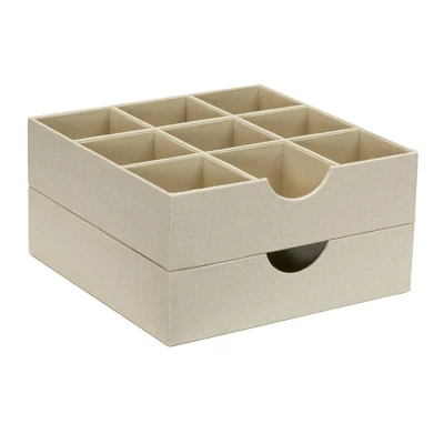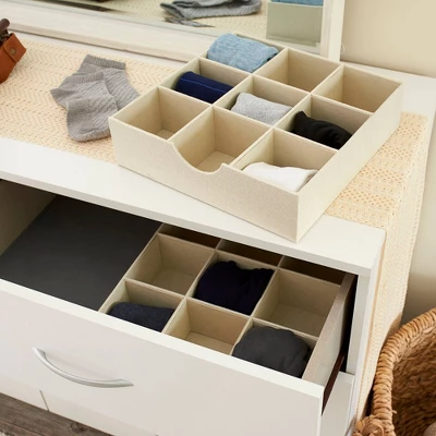 Maximize your dresser, desk, office, crafting and junk drawer space with this practical and stylish set of 2 9-Section Drawer Trays from Household Essentials. Each fashionable and functional tray is made from a sturdy chipboard and is wrapped in a soft and attractive polyester linen. Each compartment features a PP non-woven interior lining for added support and functionality. A perfect addition to any dresser or drawer, these trays are an excellent storage and organization option for jewelry, socks, underwear, accessories, makeup, craft supplies, and other loose items. Or display the 9-Section Drawer Trays in full view for a stylish storage option atop your dresser, kitchen counters, bathroom vanities or bookshelves.