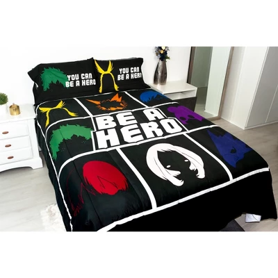 - FUN DESIGN: Black comforter reads “Be A Hero” and features colorful icons of My Hero Academia’s many heroes.