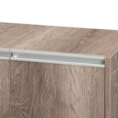Organize the entryway of your home with the sleek, contemporary style of the Langston shoe cabinet. Made in Malaysia, the Langston is comprised of sturdy wood showcasing an eye-catching weathered oak finish. Four internal shelves provide plentiful surface area to store around a dozen pairs of shoes, depending on size. The Langston requires assembly and is equipped with silver tone metal handles for ease of access. An easy and simple addition to any entryway, the Langston shoe cabinet enhances any home.