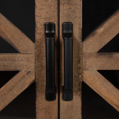 - The perfect combination of modern function and farmhouse charm, this lovely storage cabinet, features a distressed rustic metal finish with a wooden crisscross barn-door design front