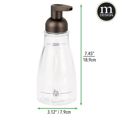 The mDesign Foaming Soap Dispenser Pump Pack is a stylish accent for your kitchen countertop or bathroom vanity! This soap dispenser looks like glass but is actually a sturdy plastic that stands up to drops and bumps when things get slippery. Plus, it’s perfect for your kid’s bathrooms! The pump head is plastic with a rust-resistant finish and complements any bathroom decor. This soap dispenser pump holds fourteen ounces of foaming soap.