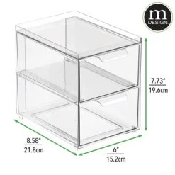 Minimize clutter and maximize bathroom space with these Stacking Organizer Storage Bins from mDesign. These minimalistic bins boast sliding drawers that keep small items neatly tucked away and optimize closet space. These versatile bins can be used on their own or in multiples in order to create custom storage in your linen, coat, bedroom, or entryway closets. Easily store hats, jewelry, scarves, gloves, washcloths, batteries, small accessories, tools, and more. The clear plastic appearance lets you find what you need quickly. mDesign – Solutions for Home. Solutions for Life.