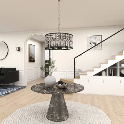 Maximize your ceiling space to add depth and dimensions in your home with this gorgeous chandelier. Beautifully designed and well crafted chandelier features eye catching structure for a mesmerizing focal point any where in your home. Use this black chandelier to cast light on your dining area or den. Requires 6 40W Type A E26/Medium (Standard) bulbs. This item ships in 1 carton. Hang decorative light with hardwired canopy and chain; nails and screws are not included. Suitable for indoor use only. Some assembly required. Includes a hardwire switch. This is a single black colored ceiling light. Glam style.