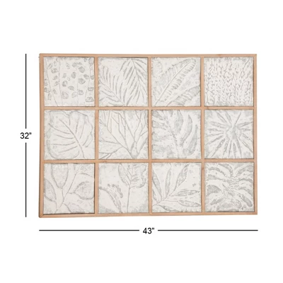 Bring personality and style to your farmhouse-themed home spaces with this framed leaf art decor displayed in your natural or vanilla-toned wall. This item ships in 1 carton. Gray-washed botanical imagery illustrated in 12 metal tiles, each placed into a 12-section natural wood frame. Can be hung horizontally using the D-rings on the back; nails and screws not included. Suitable for indoor use only. This item ships fully assembled in one piece. This is a single gray colored wall sculptures. Farmhouse style.