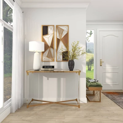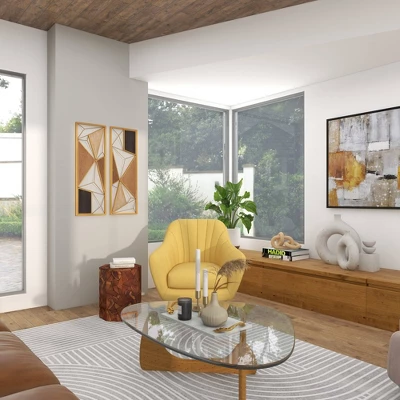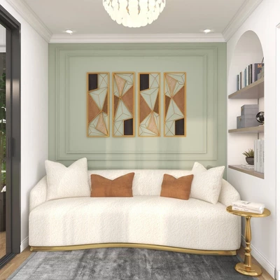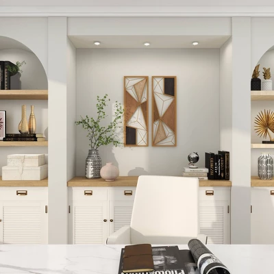 This modern wall plaque will add some unique abstract line vibes in your modern minimalist home when displayed on walls with matching Decor. This item ships in 1 carton. Pair of metal and wood wall decor panels with geometric designs. Can be hung vertically using the metal rings on the back; nails and screws not included. Suitable for indoor use only. This item ships fully assembled in one piece. This brown colored wall sculptures comes as a set of 2. Modern style.
