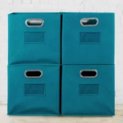 Find your Niche with versatile and modern Niche Fabric Storage Bins! Strong and durable, these bins each include a reinforced bottom panel that adds an extra layer of stability. With the bottom panel in place, they are sturdy enough to use on their own to hold files, scrapbook paper, children’s toys, towels, craft supplies and more. The bottom panel comes out and the entire bin folds flat for easy storage when not in use. Folded bins even fit perfectly inside an open one! Chrome handles are built into two sides of the bin, which makes carrying and moving it easy and worry-free. Inset handles are stronger than sewn-on cloth handles and won’t come unstitched or separate at the seams like cloth handles could. Measuring 12 x 12 x 12, Niche Fabric Bins are truly square and integrate seamlessly into Niche Cubo storage cubes. They can be used in any direction- there is no “right” side to face front because all sides measure the same! Personalize your bins by using the clear label holder on one side. Quickly and easily identify contents or assign bins to individual students. Ideal for every room in the house, make this set of 4 Teal Niche Folding Fabric Bins a part of your home or office today!