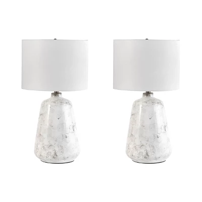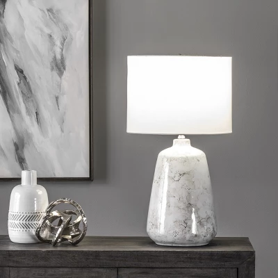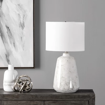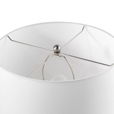 Let your room shine with the addition of this lavish 27-inch abstract table lamp. It has a Cotton Drum shade that delivers bright ambient lighting. Adds a vibrant flair to any room with its silver ceramic finish. It has a 15-inch wide, ivory cotton, drum lampshade that delivers soft lighting.