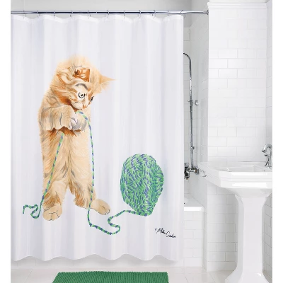 Cat lovers will love the Playful Cat (© Matthew Carlson) Shower Curtain by Allure Home Creation. This novel Shower Curtain features an adorable fuzzy kitty mischievously playing with a ball of green and periwinkle yarn. This delightful design is sure to make you say “Aaaahhh”!!! This oversized design is printed on a 100% easy care plainweave polyester. Machine wash and tumble dry on low heat.