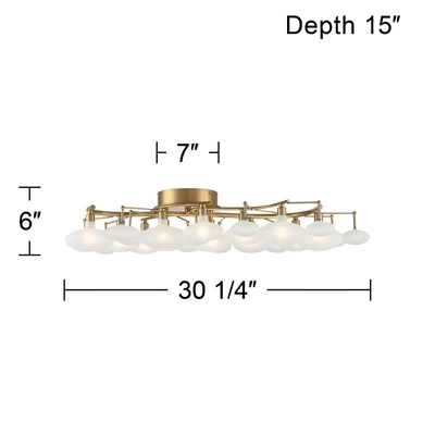 This contemporary ceiling light offers an elegant nature-inspired look. It features a garden of opal etched glass forms in different sizes. Illuminated by included LED bulbs, they provide a graceful visual impact without taking up too much space. The specially-built frame is dressed in a gleaming warm brass finish that completes this gorgeous design.