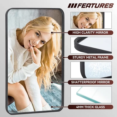 this rounded rectangular wall mirror is designed with a kind of fashion and modern industrial style. The frame is made of brushed black metal with an angled design to protect the mirror. Besides, the black mirror is anti-stripping, anti-cracking and anti-water,and it is safer and more premium than traditional recessed frames High-quality material: With premium 4mm glass, the mirror is anti-distortion, which is perfect in reflection. The well-designed packaging ensures that the rounded corner mirror is delivered safely Useable areas and purpose: this wall-mounted mirror can be used in bathroom, bedroom, living room, etc. It can be used as a vanity mirror or decorative mirror to decorate your room and you can give yourself the last look through the rectangle mirror before going out. And with a modern industrial design, it is also suitable in various hotel rooms Easy to install: The backboard of the mirror is designed by new technics, which makes it lighter. It can be installed easily and safely in both horizontal and vertical orientations. There is installation instructions on the back of mirrors and we also provide wall anchors and screws for your installation