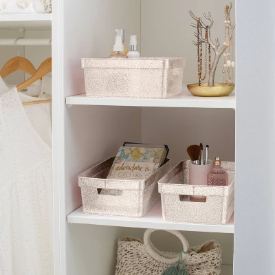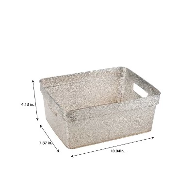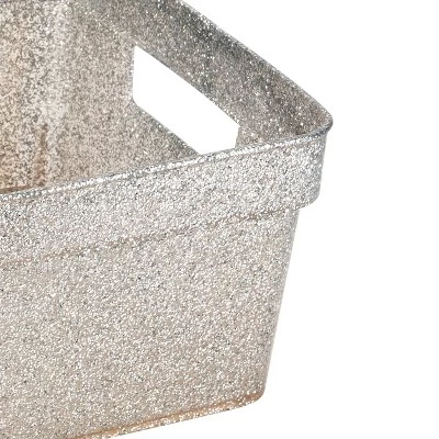 Organize and create storage in your home with the Simplify 3 Pack Small Glitter Totes. They are strong and durable, and the lightweight design makes it easy to lift and carry. The size makes these a great addition to a countertop, shelf, closet or in a deep draw. They are perfect for storing toys, office supplies, cleaning supplies, accessories and so much more! Your space with look neat and organized with the set of matching totes.