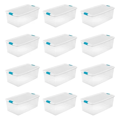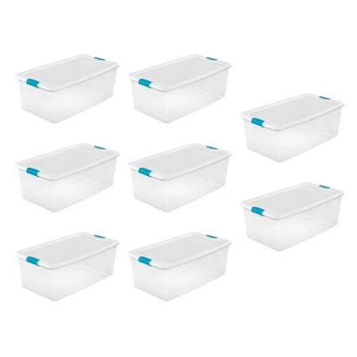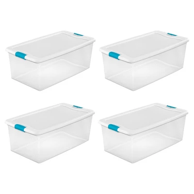 Bring total organization to your home storage system with the Sterilite 106-Quart Clear Stackable Latching Storage Box Container.These storage totes provide you with the exact space you need for varying household items. With strong latches that attach the lid securely to the base, you’ll be able to ensure the contents remain safe while stored. The see-through base allows contents to be easily identified and the totes are designed to stack on top of each other, making excellent use of verticle storage space, without the hassle of wondering what items are in which tote.A 106-quart capacity makes these storage totes ideal for storing decorations, sports equipment, keepsakes, special occasion items, toys, hobby equipment, and more. This set of latched lid storage boxes is ideal for storing your belongings in the basement, garage, and attic, and won’t buckle, break, or leak in non-insulated environments.Clear some clutter from your life and tuck away your belongings in the 106-Quart Clear Stackable Latching Storage Box Container from Sterilite.
