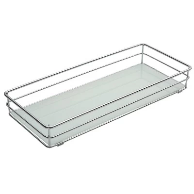 This Elle Décor Vanity Tray features a chrome finish, tempered glass bottom and an attractive design to add the right touch of elegance. Fits easily on a bedroom dresser or bathroom countertop and is a perfect place to store your perfumes, cosmetics, jewelry, toiletries & more.