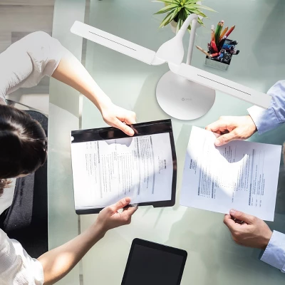 Create a customized lighting setup with this height-adjustable OttLite Pivot LED Desk Lamp with Dual Shades. Exclusive ClearSun LED technology optimizes illumination while helping reduce eyestrain by 51%. A color rendering index of 97 provides this dimmable OttLite pivot dual-shade LED desk lamp with outstanding color accuracy, and the three color modes with touch-activated controls enable easy adjustments.