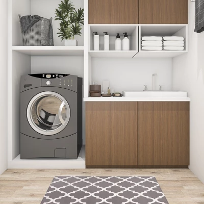 Enliven your kitchen flooring with this fashionable anti-fatigue mat. The neutral grey color and white trellis-pattern design add a flash of casual, contemporary appeal to your decor, while the durable PVC material cushions your step for enhanced comfort and support while you wash and dry dishes. This versatile mat is also ideal for use in bathrooms and laundry rooms. A rubber-lined backing keeps the mat securely in place and prevents accidental slips and falls. Machine-made manufacturing ensures consistent quality.