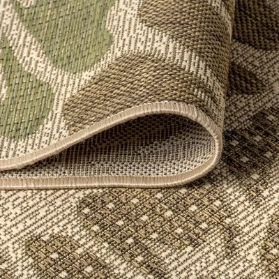 Add some graphic punch to your porch or patio with the bold blooms on our modern floral rug. The large-scale pattern has a geometric effect in a simple palette of leafy green, deep blue and beige. The flatweave design is great for high-traffic spaces indoors too.